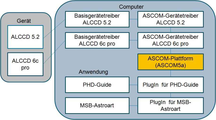 Der Programmierer der Kameraunterstützung muss sich nur noch um den Basisgeräte-Treiber und einen ASCOM-Gerätetreiber kümmern. Kenntnisse zur Anwendung muss er nicht haben.Der Programmierer der Anwendung muß sich nur noch um die Verbindung zur der ASCOM-Schnittstelle kümmern und nicht mehr um Details zur Kamera-Programmierung. Dieses kann in der Anwendung als Plugin oder programmintern erfolgen.Die Anwender müssen für ASCOM-kompatible Kameras in der Anwendung für die Kamera "ASCOM" wählen und unter "ASCOM" die passende Kamera auswählen. Das ist für alle Anwendungen, die ASCOM unterstützen, gleich. Für die ALccd-Kameras ist das für die wichtigten Applikationen wie MSB-Astroart, MaximDL als auch für das Programm PHD-Guide realisiert.Wir als astrolumina haben auf diese Vereinfachung gedrängt und sind der festen Überzeugung, das sich diese Schnittstelle weiter durchsetzen wird.