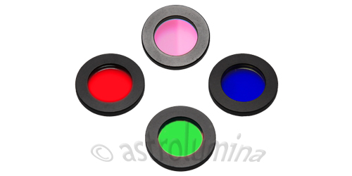 Dieser Interferenz-Filtersatz kommt zum Einsatz, wenn mit monochromen CCD-Kameras Farbaufnahmen produziert werden sollen. Die Farbinformation wird aus den einzelnen Farbkanälen R+G+B generiert und mit dem Luminanzbild (L) zur Auflösungssteigerung kombiniert. Somit können Sie auch mit einer Schwarzweißkamera Farbbilder erzeugen. Ein Filterrad oder eine Filterschublade ist zur einfacheren Handhabung zu empfehlen.
