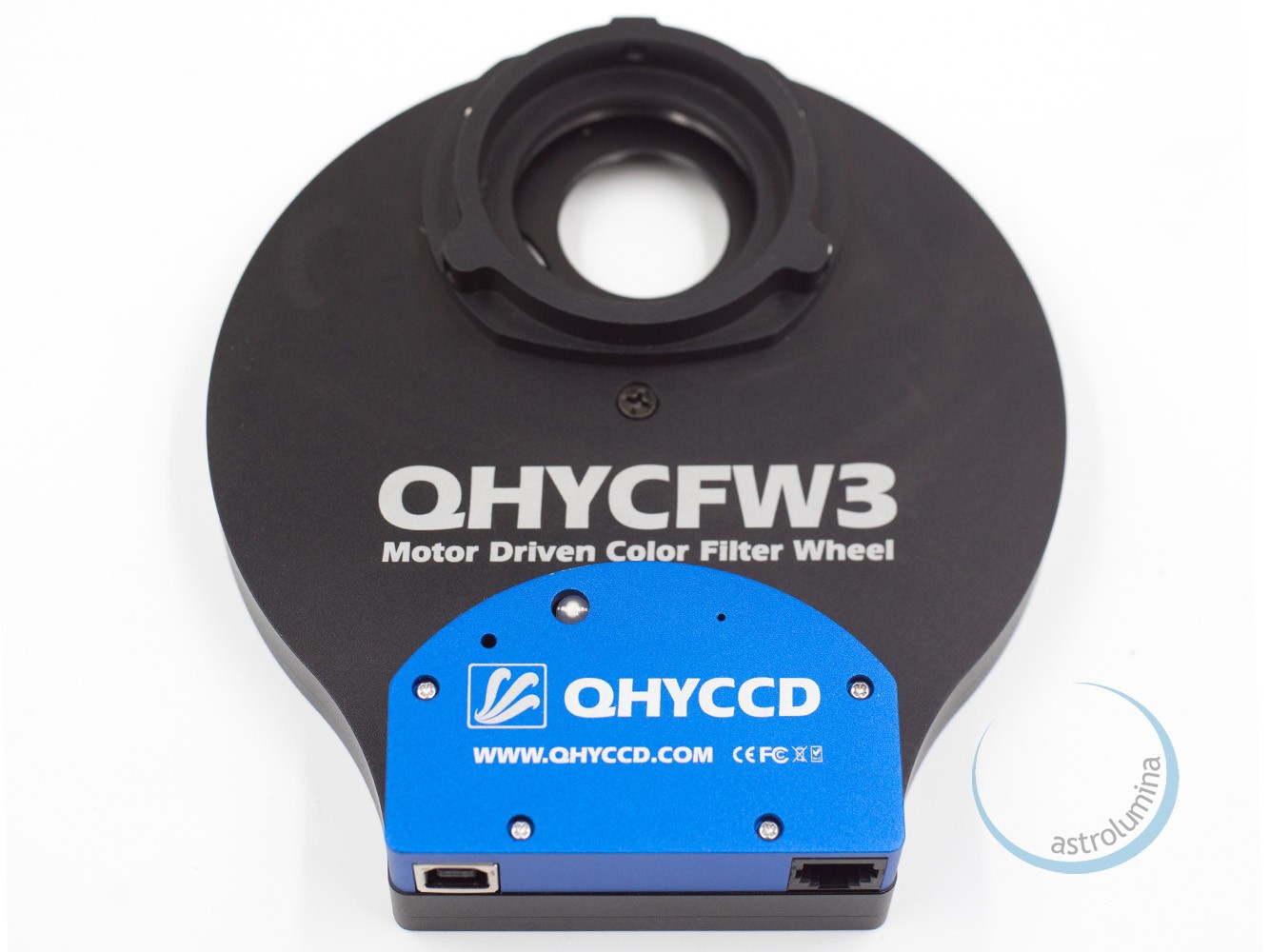Der neue und optimierte Reibradantrieb in Verbindung mit einem Hybrid-Schrittmotor, erlaubt reproduzierbare Positionierungen der einzelnen Filter, die mit einer extremen Genauigkeit erfolgen.Der Motor ist gekapselt und somit gegen Staub und weitere Umwelteinflüsse geschützt.Die zentrale Achse des Filterträgers wird über eine präzise Kugellagerung geführt, nicht über eine Gleitlagerung.Das Filterrad ist so konstruiert, dass die Dicke der Filter in einem Bereich von 0,7 bis 5,0mm (Version CFW3S-SR) betragen kann, so dass auch Baader-Einschraubfilter passen.Das CFW3-Filterrad verfügt neben dem USB- auch über den obligatorischen RJ12-Port, an dem Sie das Kommunikationskabel zur ALccd-QHY-Kamera (Kameramodelle mit Filterradport) anschließen können. Somit ist der Anschluß eines USB-Kabels am CFW3 unnötig.Wie fast alle ALccd-Produkte, verfügt das CFW3 ALccd-Filterrad auch über ASCOM-Treiber. Somit können Sie es über jede ASCOM-fähige Software betreiben, wie z.B. MaxIm DL, AstroArt oder unserem kostenlosen EZCap_qt, wenn Sie eine ALccd-QHY-Kamera besitzen.