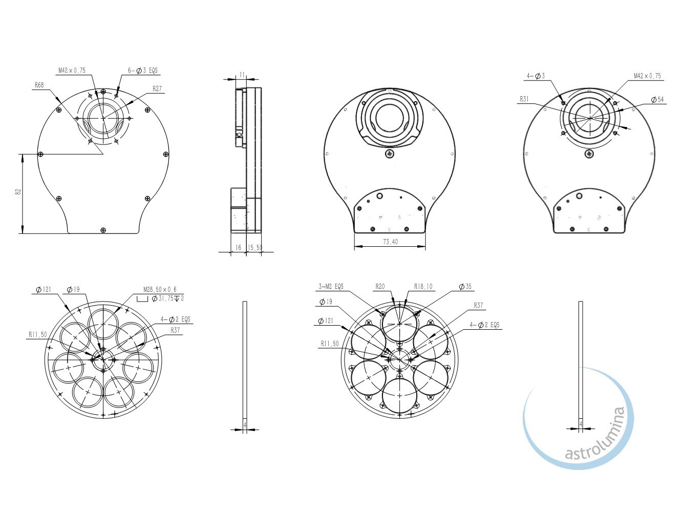 Das ALccd-QHY CFW3S-Filterrad ist vorgesehen zur Aufnahme von 6 Stück 36mm-Einlegefilter (CFW3S-US) oder 7 Stück 1.25 inch Schraubfilter (CFW3S-SR). Das gewünschte Modell können Sie im Bestellablauf auswählen.Beide Anschlussgewinde sind M42x0,75mm (T2-Gewinde), so dass keine Abschattungen auftreten können. Das Filterradmodell CFW3S-US gehört zu den flachsten und leichtesten motorischen 36mm-Rädern. Es hat ein Dicke von nur 15,5mm (ohne Steckadapter) und wiegt lediglich 419g (CFW3S-US inkl. Steckadapter). Eine komplett ausgestattete ALccd-QHY 9 wiegt somit keine 1.000g.Damit das Filterrad auch unabhängig von einer ALccd-QHY-Kamera betrieben werden kann, liefern wir es mit einem universellen USB-Anschluss und passendem Softwaretreiber aus.